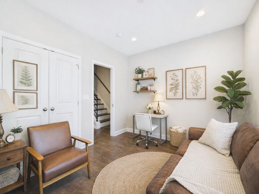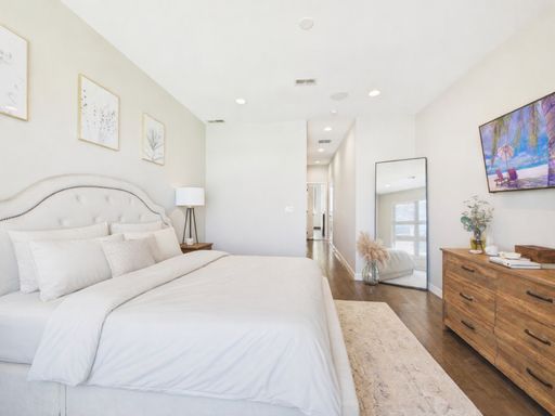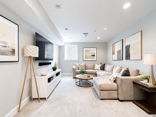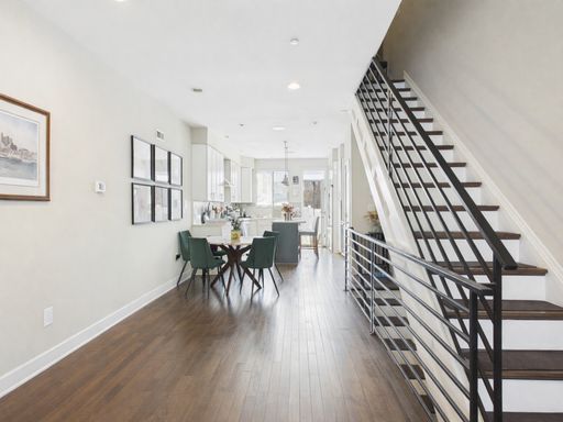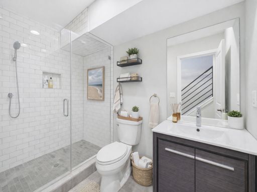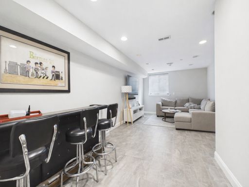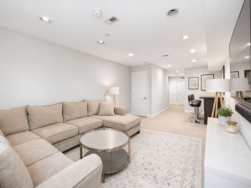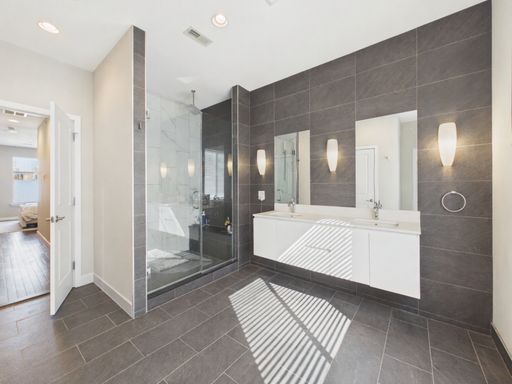 Beautiful modern home featuring bright, open living spaces, hardwood floors, and high-end finishes throughout. The spacious layout includes a finished basement for additional living or entertainment space and a sleek wet bar area. The primary suite offers a spa-style bathroom with a large glass walk-in shower, double vanity, and a generous walk-in closet.
