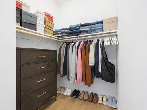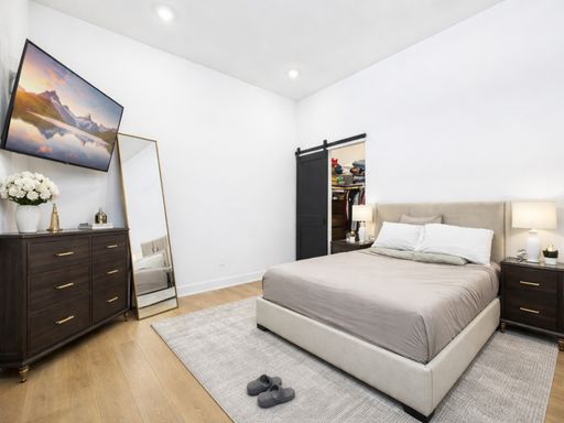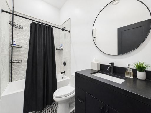 The bedroom offers a generous layout with a large closet and plenty of room for additional furniture. The bathroom is stylishly finished with modern fixtures and a clean, updated design.