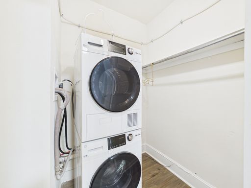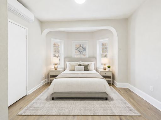 The spacious bedroom easily fits a full furniture set and is filled with natural light. The updated bathroom includes a glass-enclosed walk-in shower with custom tilework for a clean, contemporary look.